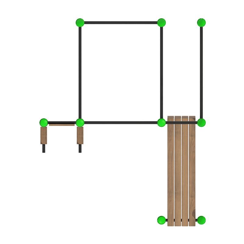 Материалы: Стойка - труба стальная Ø 76/89/108 мм; Перекладина - труба стальная Ø 33 мм; Пластиковый хомут с отверстиями для перекладин, с возможностью ее фиксации от поворота и прочной фиксацией на вертикальном опорном столбе. Хомут стягивается двумя болтами; Клееный брус 100х100 мм; Фанера 18 мм; Эллиптическая заглушка Ø 76/89/108 мм.