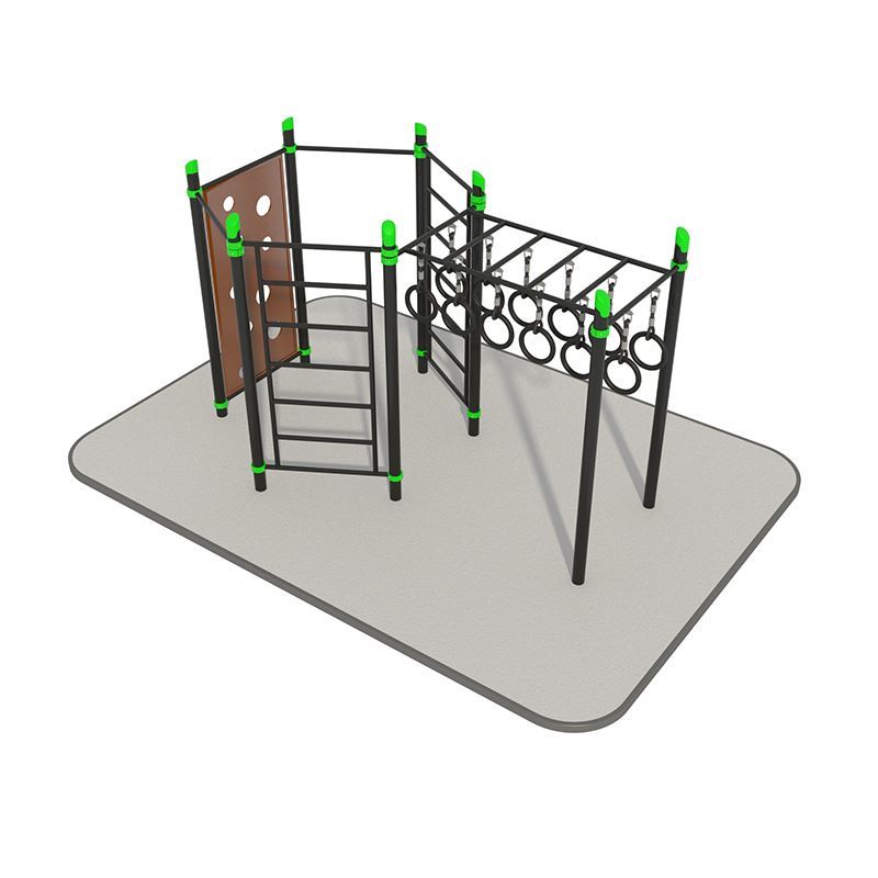 Материалы: Стойка - труба стальная Ø 76/89/108 мм; Перекладина - труба стальная Ø 33 мм; Пластиковый хомут с отверстиями для перекладин, с возможностью ее фиксации от поворота и прочной фиксацией на вертикальном опорном столбе. Хомут стягивается двумя болтами; Ламинированная фанера 18 мм; Антивандальные гимнастические кольца на армированном канате 16 мм; Эллиптическая заглушка Ø 76/89/108 мм.