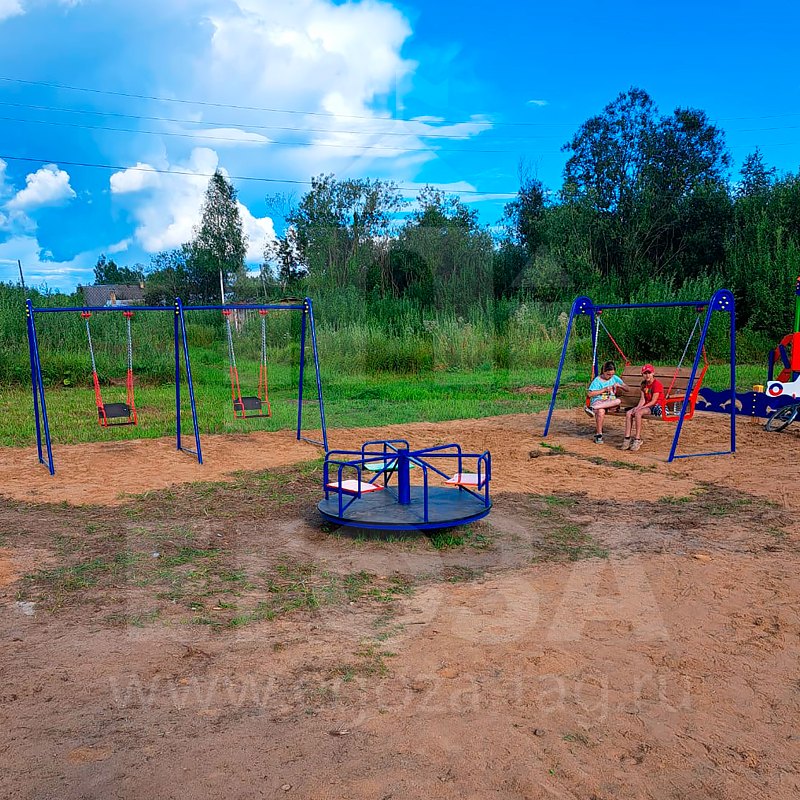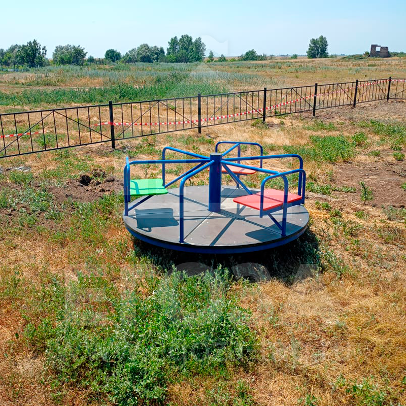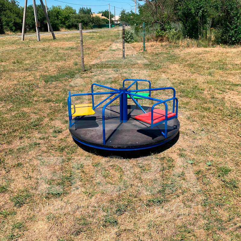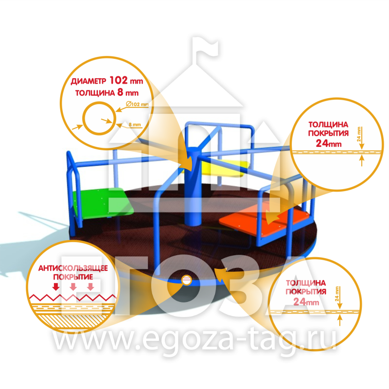 Комплектация: Карусель «Шестиместная», Стойка карусели. Стойка карусели изготавливается из металлического прутка диаметром 50 мм. В карусели используются круглые трубы диаметром 102мм, 33,5мм и профильная труба размером 40х20 мм. Сидения карусели изготовлены из влагостойкой фанеры толщиной 24 мм. Пол карусели выполнен из ламинированной фанеры толщиной 24 мм.
