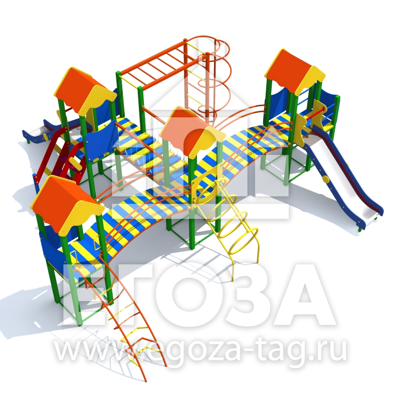 Комплектация: четыре башни с двускатной крышей, две горки, лестница, кольца, подвесной и страховочный мостики, дугообразная лестница, два дугообразных моста, перила дугообразных мостов, рукоход, стойка с лианой.