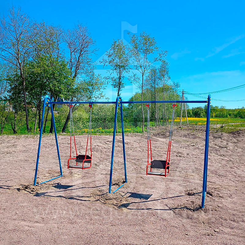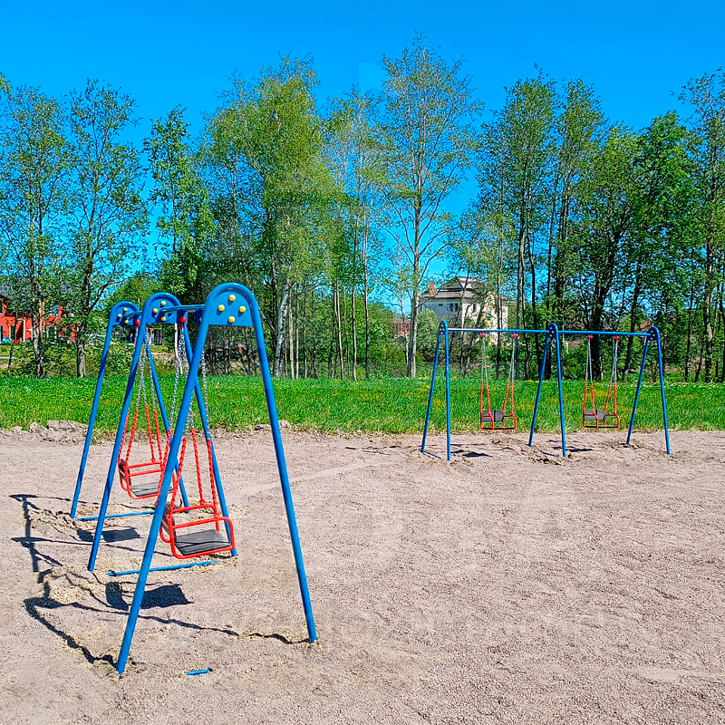Опоры на фланцах и горизонтали качелей изготовлены из металлической трубы Ø42.3 мм. Качели на гибких подвесах изготовлены из металлической трубы Ø21,3, сидение и спинка изготовлены из влагостойкой фанеры толщиной 15мм.